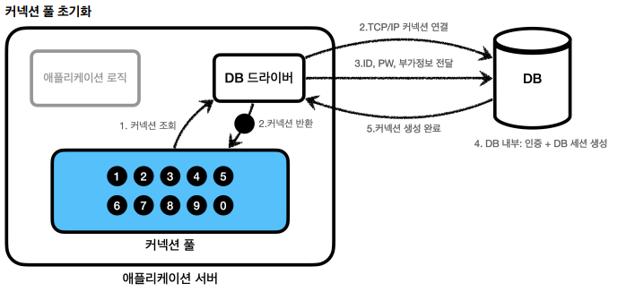 커넥션 풀에 들어있는 커넥션은 TCP/IP로 DB와 커넥션이 연결되어 있는 상태이기 때문에 언제든지 즉시 SQL을 DB에 전달할 수 있다.
