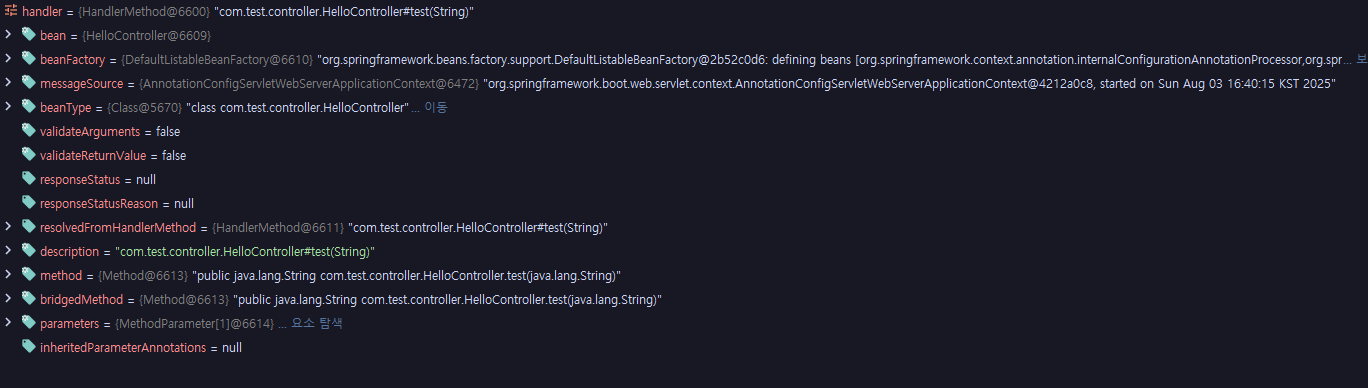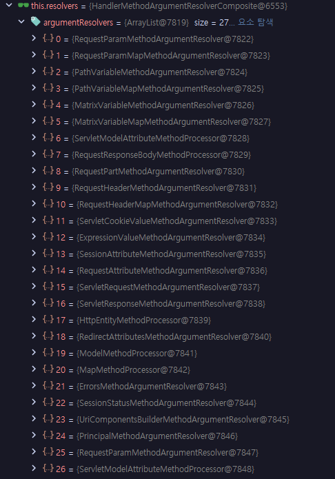 @RequestParam, @PathVariable, @RequestHeader 등의 어노테이션이 스프링의 ArgumentResolver에 의해 처리가 되고, 이와 관련한 작업이 수행되는 곳이 getMethodArgumentValues() 메서드입니다.