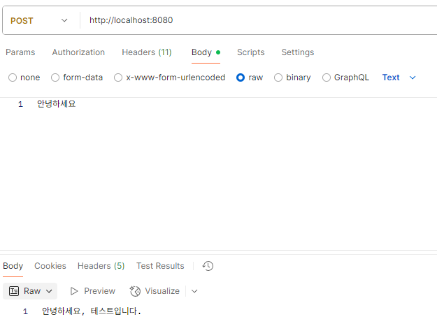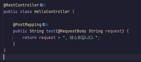 또한 @RestController 어노테이션을 사용했기 때문에 ModelAndView가 아닌 String 문자열이 그대로 응답 값으로 반환이 됩니다.