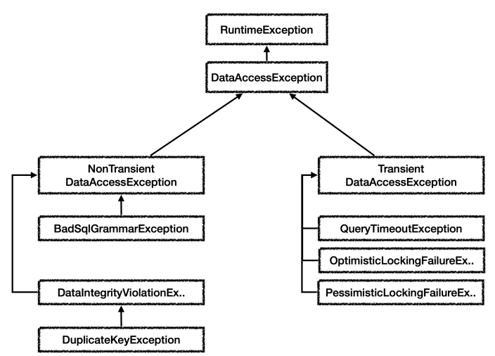 스프링 예외 추상화 이해스프링 데이터 접근 예외 계층 스프링은 데이터 접근 게층에 대한 수십가지 예외를 정리해서 일관된 예외 계층을 제공한다.각각의 예외는 특정 기술에 종속적이지 않게 설계되어 있다. 따라서 서비스 계층에서도 스프링이 제공하는 예외를 사용하면 된다.JDBC나 JPA를 사용할 때 발생하는 예외를 스프링이 제공한느 예외로 변환해주는 역할도 스프링이 제공한다.그림 단순화를 위해 일부 계층을 생략했다. 예외의 최고 상위는 org.springframework.dao.DataAccessException 이다. 런타임 예외를 상속 받았기 때문에 스프링이 제공하는 데이터 접근 계층의 모든 예외는 런타임 예외이다. DataAccessException은 크게 2가지로 구분하는데 NonTransient 예외..